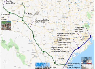 Simpático Pipeline: 600 km (373 miles), 16-inch diameter. Carries high-purity products to East Texas Gas Hub near Mont Belvieu. Includes 2 pumping/pigging stations.